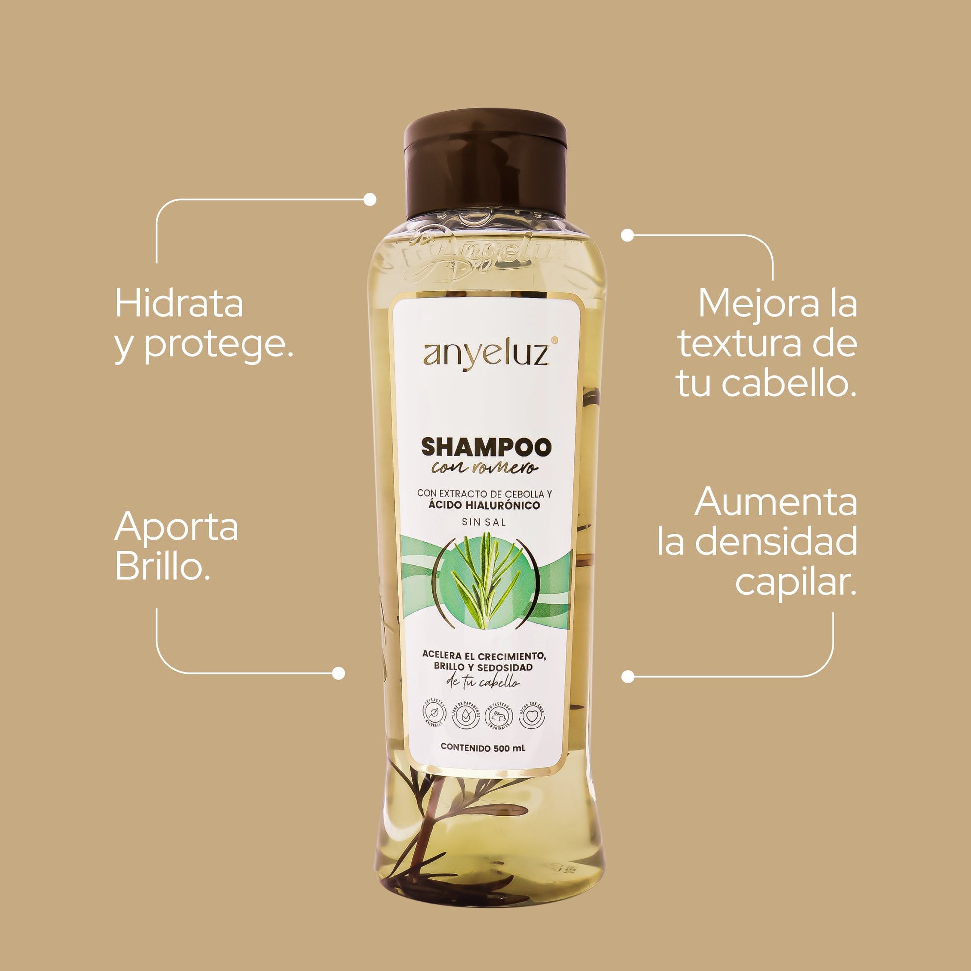 *Envío gratis en compras mayores a $100,000. Para compras menores, el envío se realiza con pago contra entrega.* Shampoo con romero Anyeluz Formulado con extracto de cebolla, ácido hialurónico y romero, ayuda a estimular el crecimiento del cabello, aportando brillo, sedosidad e hidratación. Ideal para fortalecer la fibra capilar y lograr un cabello más sano, fuerte y luminoso. ✨
