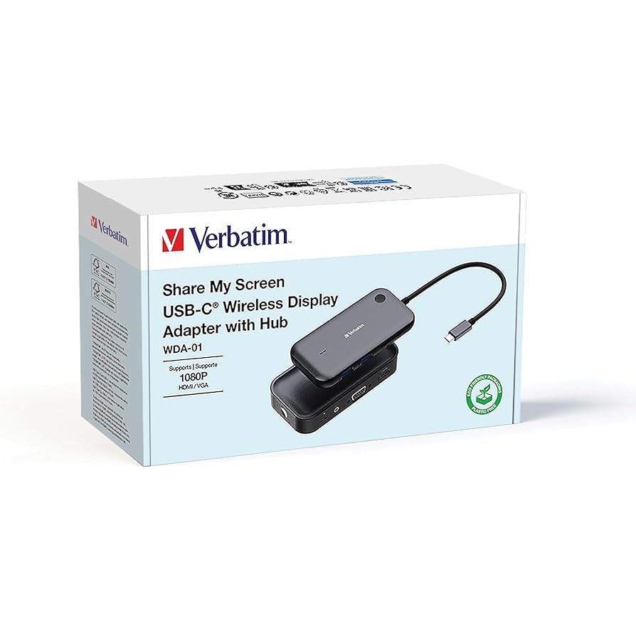 Verbatim | Share My Screem Adaptador pantalla inalámbrico. USB-C™ 1080p WDA-0- para HDMI o VGA. Hub integrado con 2 puertos USB-A y ranuras SD/microSD (incluye cable USB-C™ de 10 cm).